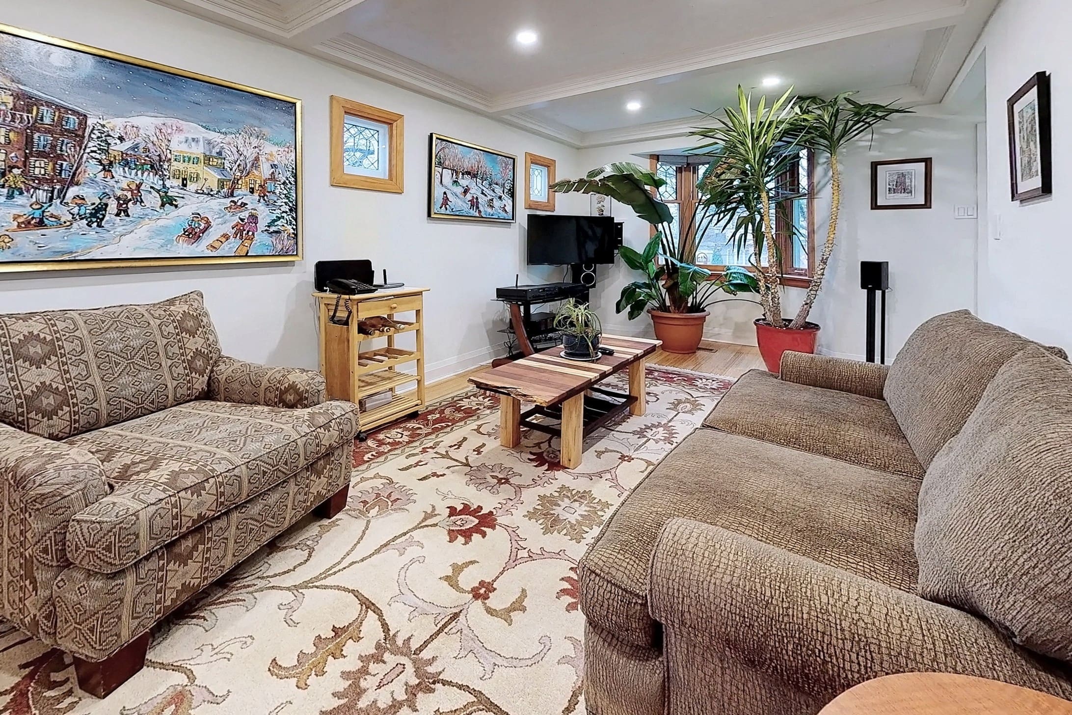 glass windows in living room add a touch of old-world charm. Leaded glass