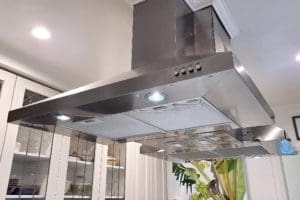 in the functional island. - Over the island is a beautiful stainless steel double range hood with
